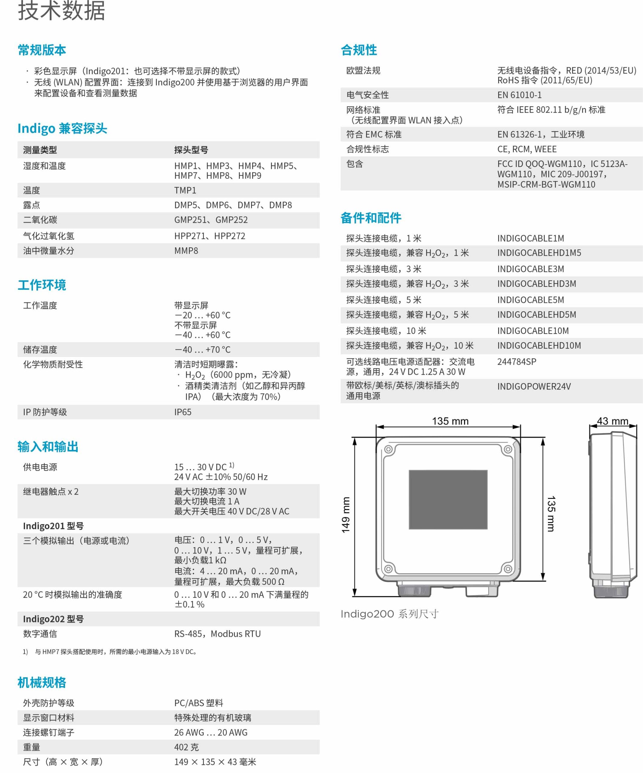 維薩拉Indigo200系列主機設(shè)備是維薩拉Indigo產(chǎn)品系列的一部分,適用于維薩拉的智能獨立濕度探頭(HMP1,HMP3、HMP4、HMP5、HMP7、HMP8和HMP9)、露點探頭(DMP5、DMP6、DMP7和DMP8)、溫度探頭(TMP1)、CO2探頭(GMP251和GMP252)、油中微量水分探頭MMP8以及氣態(tài)過氧化氫探頭系列HPP270(包括HPP271和HPP272,前者可測量氣化過氧化氫濃度(ppm),后者可測量氣化過氧化氫濃度(ppm)、溫度和濕度(相對濕度和相對飽和度))。HPP272探頭還可測量其他計算參數(shù),如露點和水汽壓力測量值。