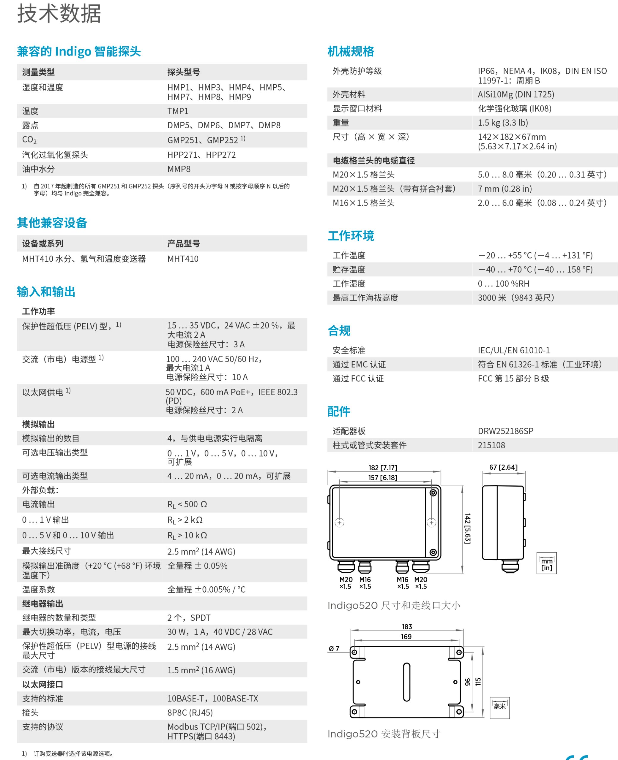 附帶雙探頭和多參數(shù)支持的維薩拉Indigo520變送器是用于與維薩拉Indigo兼容的、獨(dú)立智能探頭的主機(jī)設(shè)備。該變送器為Indigo探頭提供多種附加功能。觸摸顯示屏提供本地數(shù)據(jù)的可視化,方便配置探頭。與使用獨(dú)立的智能探頭相比,該變送器還提供更多的連接方式、供電電壓和接線方式的選擇。在適合進(jìn)行墻壁安裝式探頭安裝時,它還提供機(jī)械支撐。其堅固的IP66和NEMA4等級的金屬外殼確保在苛刻環(huán)境下也能具有可靠的性能。Indigo520與HMP1、HMP3、HMP9、HMP7或TMP1探頭配合使用,可用于測量氣壓、濕度和溫度。